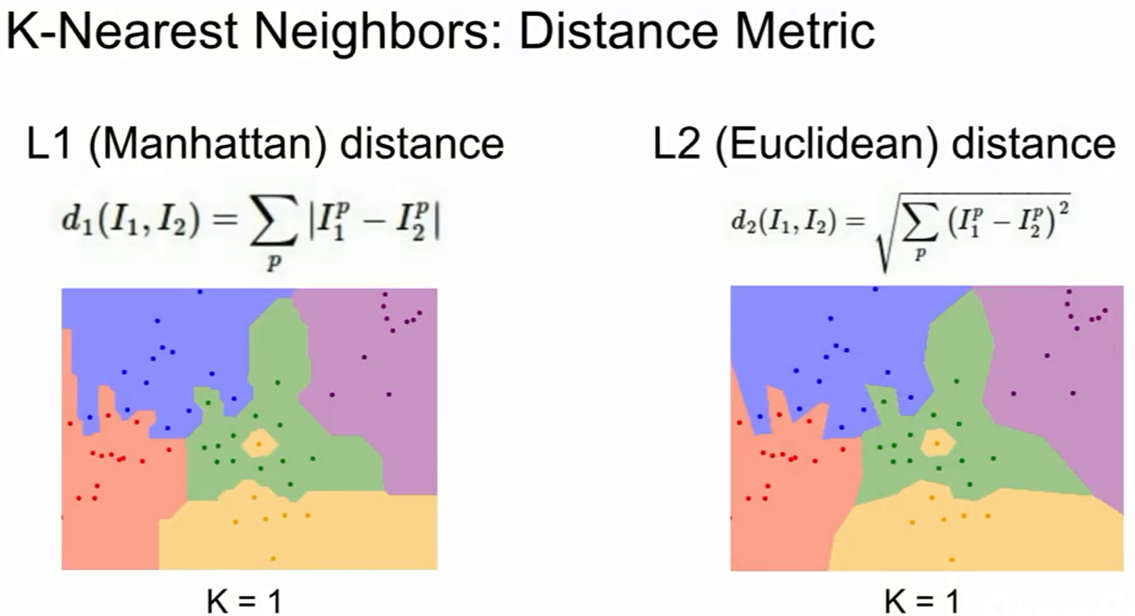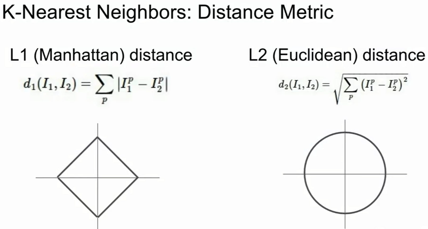 k-NN을 사용할 때 결정해야할 한 가지 사항은 서로 다른 점들을 어떻게 비교할 것인지이다. 지금까지는 L1 Distance, 즉 픽셀 간 차이 절대값의 합을 이용했다. 또 다른 방법은 L2, Euclidean Distance, 즉 제곱 합의 제곱근을 거리로 이용하는 방법이다.