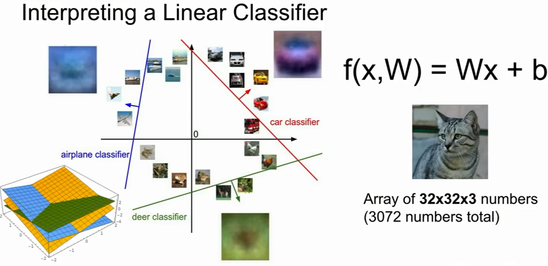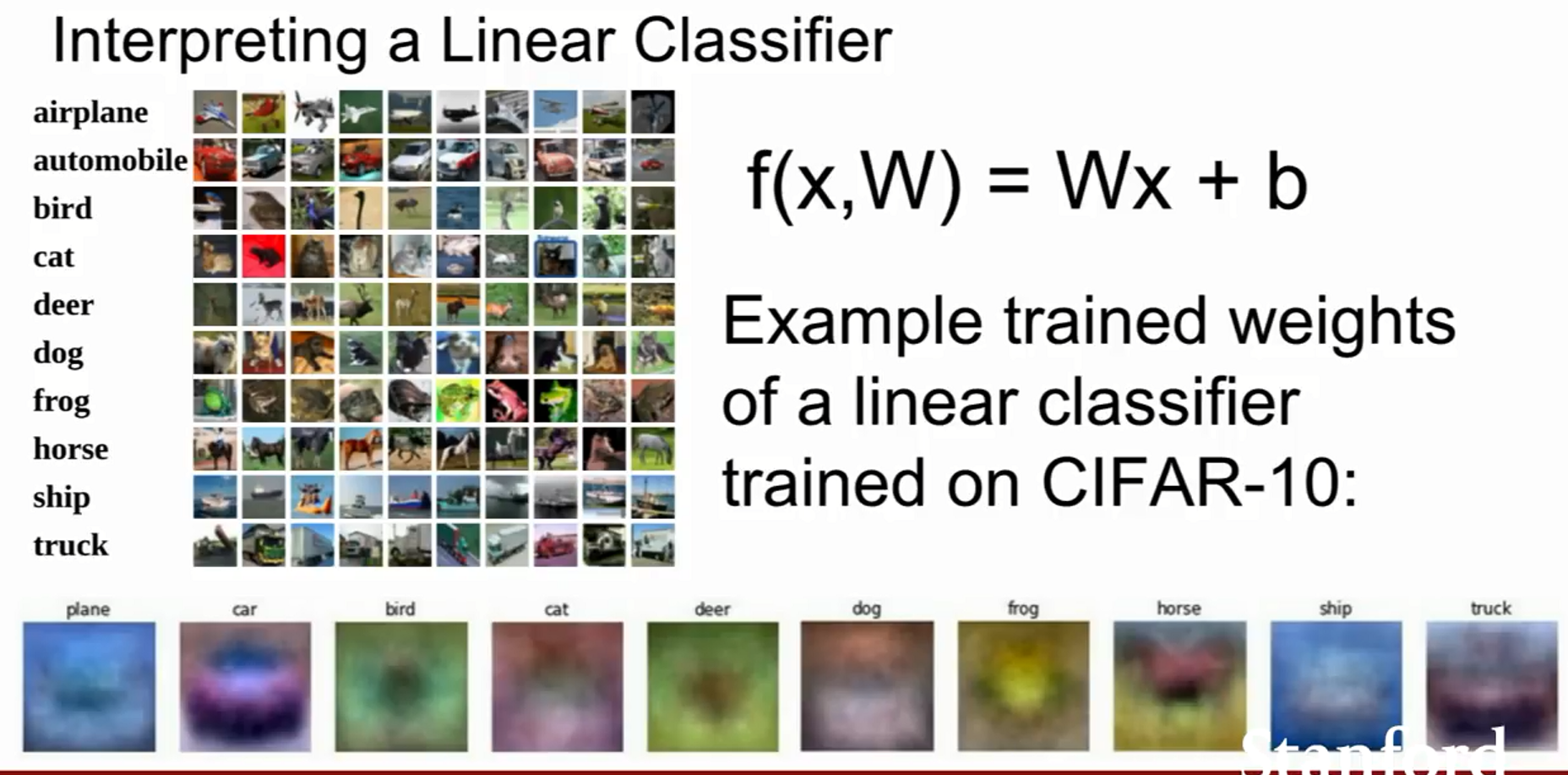 템플릿 매칭의 관점에서 linear classification을 해석해보면 가중치 행렬 W의 한 행을 뽑아서 이를 이미지로 시각화시켜보면 linear classifier가 이미지 데이터를 인식하기 위해서 어떤 일을 하는지 짐작할 수 있다. 이 예제에서는 linear classifier가 이미지를 학습하고, 슬라이드 하단의 이미지는 실제로 가중치 행렬이 어떻게 학습되는지를 볼 수 있다.