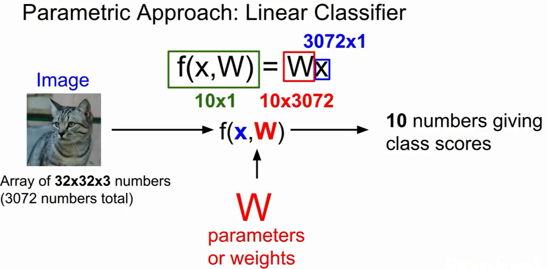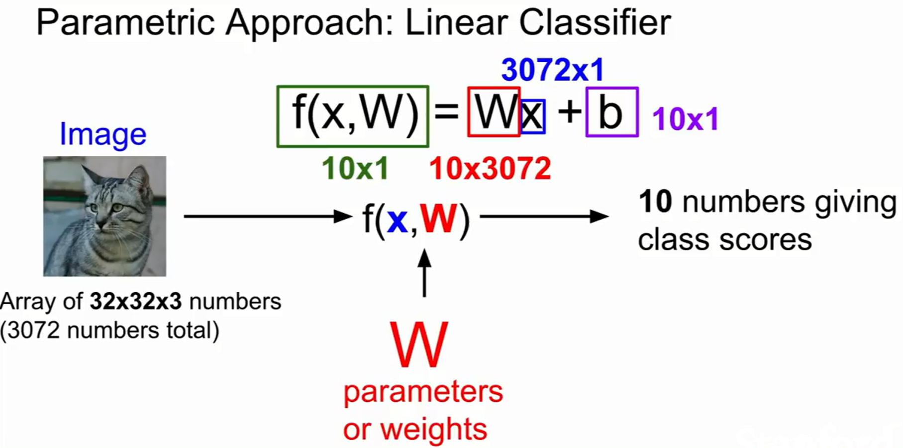 직전에 배웠던 k-NN은 파라미터가 없었다. 그저 전체 training set을 가지고 있었고 모든 training set을 test time에 사용했다. 하지만 parametric approach에서는 training data의 정보를 요약하고 그 요약된 정보를 파라미터 W에 모아준다. 이런 방식을 사용하면 test time에서 더 이상 training data가 필요하지 않다. 그래서 이런 방법은 핸드폰과 같은 작은 디바이스에서 모델을 동작시켜야할 때 아주 효율적이다.