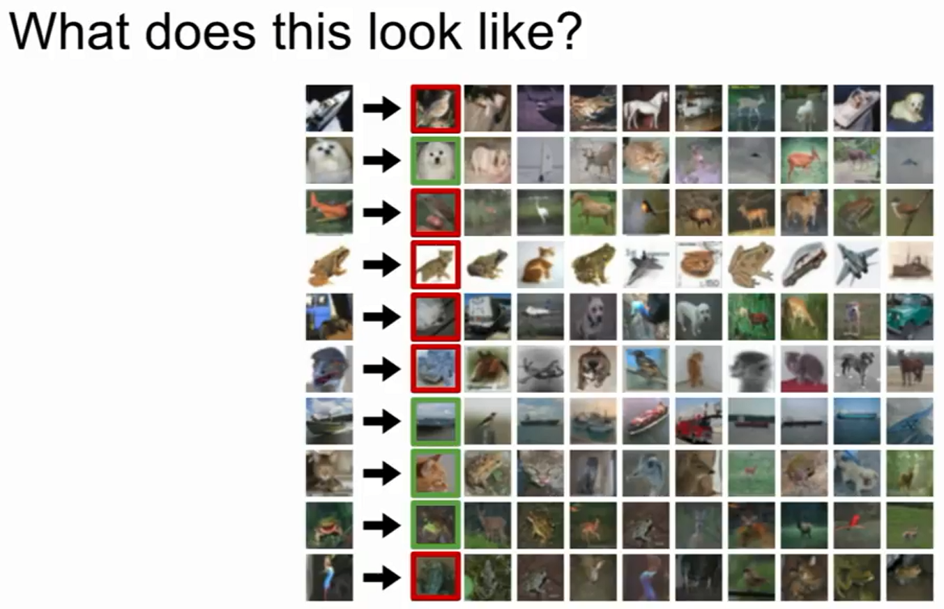 이미지를 다루는 문제에서 k-NN을 사용하는 전략은 그닥 좋은 방법이 아니다. 위의 예시에서 잘 분류되었는지 아닌지를 초록/빨간색으로 표시한 것인데, 빨간색이 더 많은 것으로 보아서 성능이 별로 안 좋다.