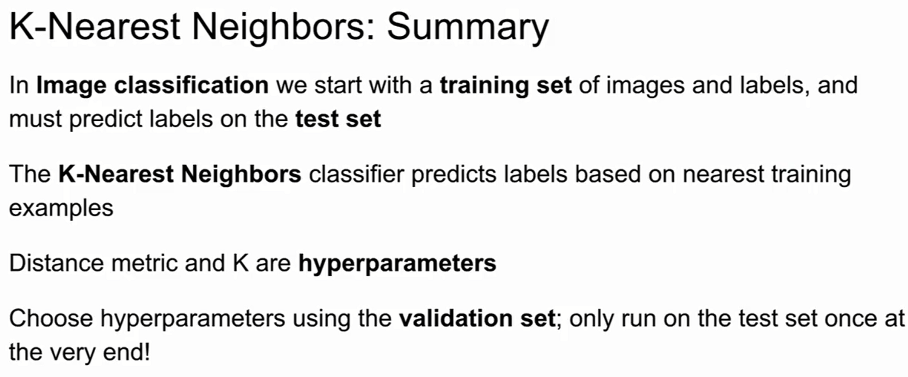 지금까지 k-NN이 기계학습 알고리즘이라는 점에서 지닌 다양한 특성들에 대해 배웠는데, 하지만 실제로는 성능이 엄청 좋지는 않고, 특히 이미지에는 잘 사용하지 않는다.