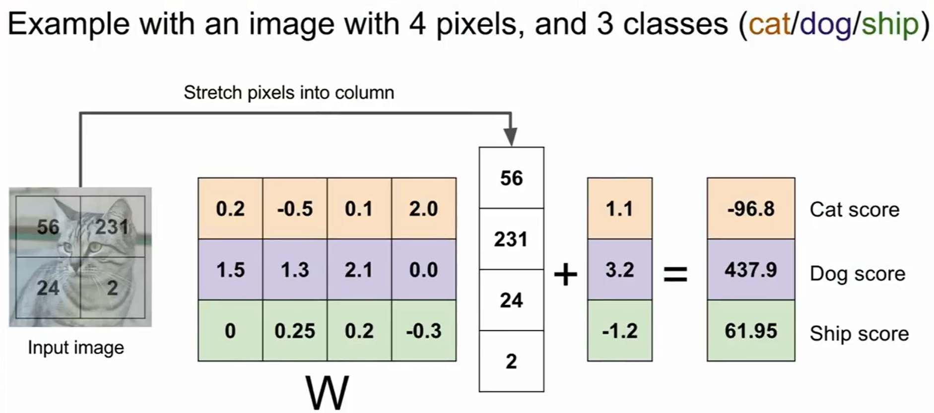 위의 그림을 보면 왼쪽에 2 x 2이고 전체 4개의 픽셀을 가진 입력 이미지가 있다. 이 linear classifier은 2 x 2 이미지를 입력으로 받고 이미지를 4-dim 열 벡터로 쭉 편다. 10개의 클래스 중 고양이, 개, 배의 3가지 클래스만 여기서 예시로 보겠다. 가중치 행렬 W는 4 x 3 행렬이 되고, 이런 식을 입력은 픽셀 4개고, 클래스는 총 3개이다. 그리고 추가적으로 3-dim bias 벡터가 있어서 bias는 데이터와 독립적으로 각 카테고리에 연결된다.