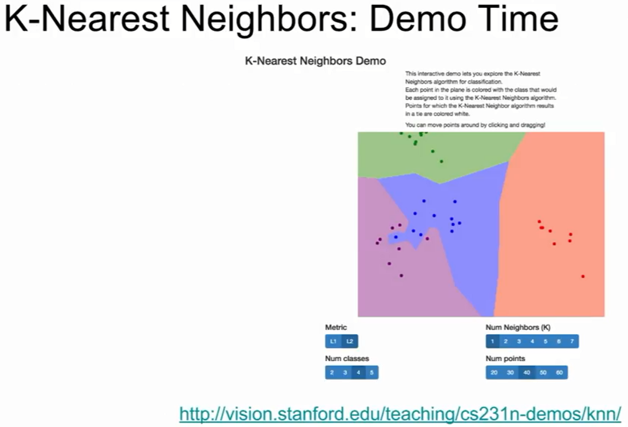 저스틴의 위 웹 데모사이트에서 여러분만의 k-NN 분류기를 설계할 수 있다. k와 거리 척도를 바꿔보면서 어떻게 결정 경계가 만들어지는지 직관을 얻을 수 있다.
