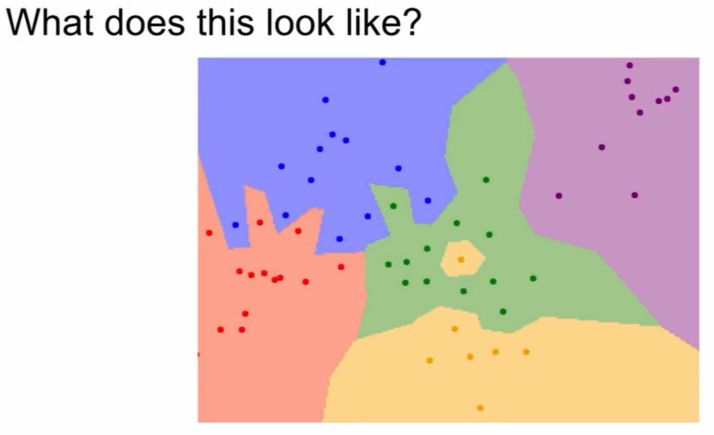 NN 알고리즘을 실제로 적용해본다면 어떤 모양일까? 위의 그림은 NN의 decision regions의 그림이다. 2차원 평면 상의 각 점은 학습 데이터이고, 점의 색은 클래스 레이블(카테고리)이다. 2차원 평면 내의 모든 좌표에서 각 좌표가 어떤 학습 데이터와 가장 가까운지 계산하고, 각 좌표를 해당 클래스로 칠했다. NN 분류기는 공간을 나눠서 각 레이블로 분류한다. 이 분류기의 문제점은 NN 알고리즘은 가장 가까운 이웃만을 보기 때문에 초록색 무리 가운데 가운데 노란색 부분과 같이 예외가 생긴다. 파란색 영역을 침범한 초록, 빨간 영역도 마찬가지이다. 이렇게 잡음(noise), 가짜(spurious)가 생긴다.