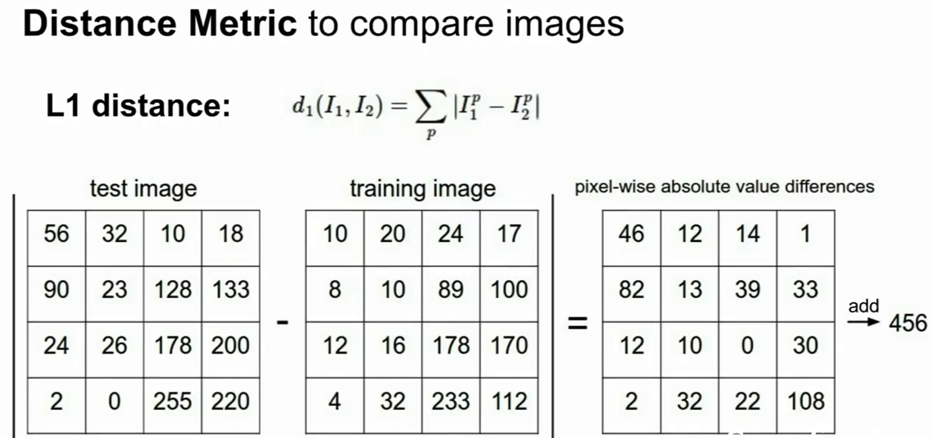 위에서 테스트 이미지와 학습 데이터를 비교하듯이 이미지 쌍이 있을 때 어떻게 비교를 할지가 중요하다. 테스트 이미지 하나를 모든 학습 이미지들과 비교할 때 여러가지 비교 방법들 이 있고, 이것들은 어떤 비교 함수를 사용하는지에 달려있다.