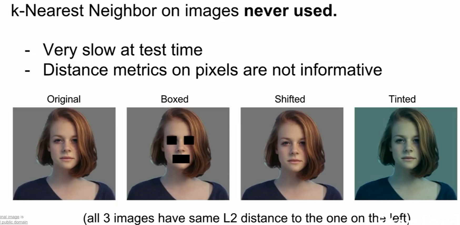 한 가지 문제는 k-NN이 test일 때 더 느리다는 것이고, 또 하나의 문제는 L1 / L2 Distance가 이미지 간의 거리를 측정하기에 적절하지 않다는 것이다.