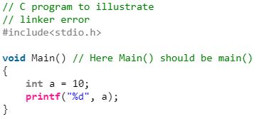 실행 파일이 만들어질 수 없을 때 에러가 발생한다. 이것은 잘못된 function prototyping, incorrect header files 때문에 발생할 수 있다. 가장 흔한 linker error 중 하나는 main()이라고 쓰지 않고 Main()이라고 쓰는 것이다.