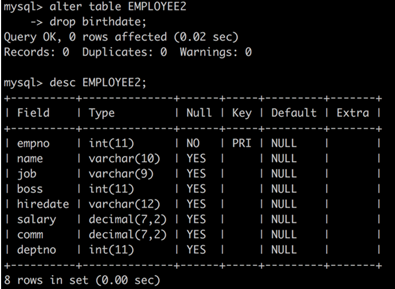 -예: EMPLOYEE2 테이블이 생일(birthdate) 칼럼을 삭제하시오.