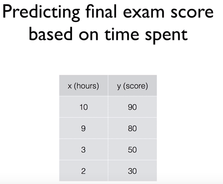 3. Predicting exam score : 이전에 시험을 본 사람들의 공부 시간과 성적 등의 자료들로 예측한다.