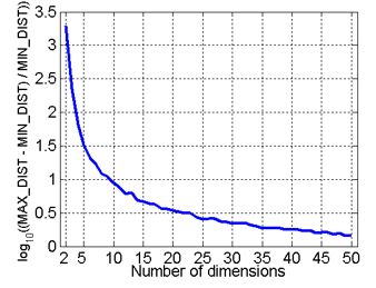 - 최소 거리와 최대 거리의 차이가 최소거리의 몇 배나 되는지 log 스케일로 나타내면 아래와 같다.